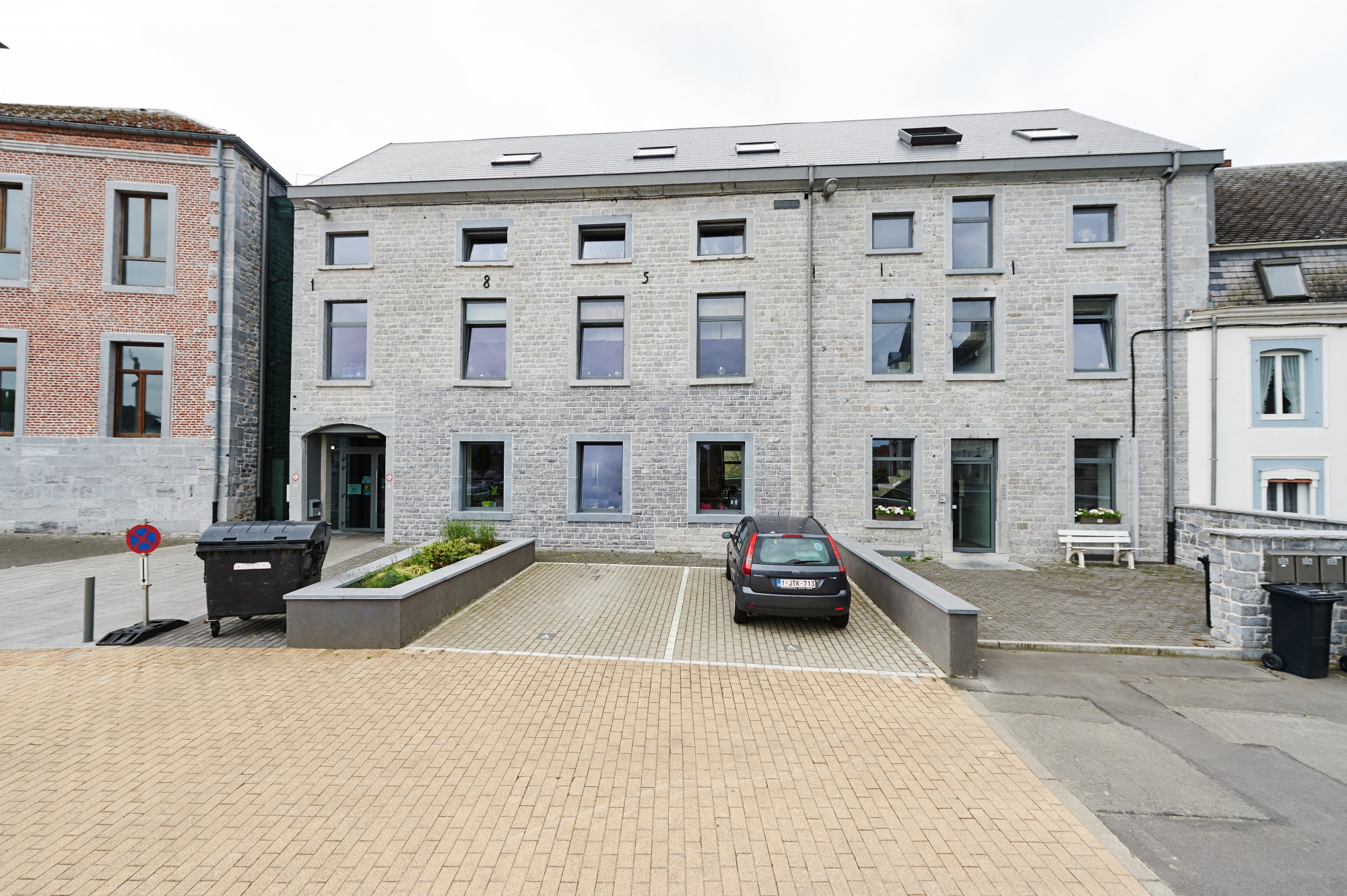 Le bâtiment est composé de 2 ailes entourant un jardin entièrement emmuré. Une rénovation lourde était indispensable afin d’adapter la nouvelle affectation aux exigences actuelles d’isolation, de confort et de sécurité. Le projet associe un centre administratif (C.P.A.S., services) à une salle des fêtes et à 5 logements publics.