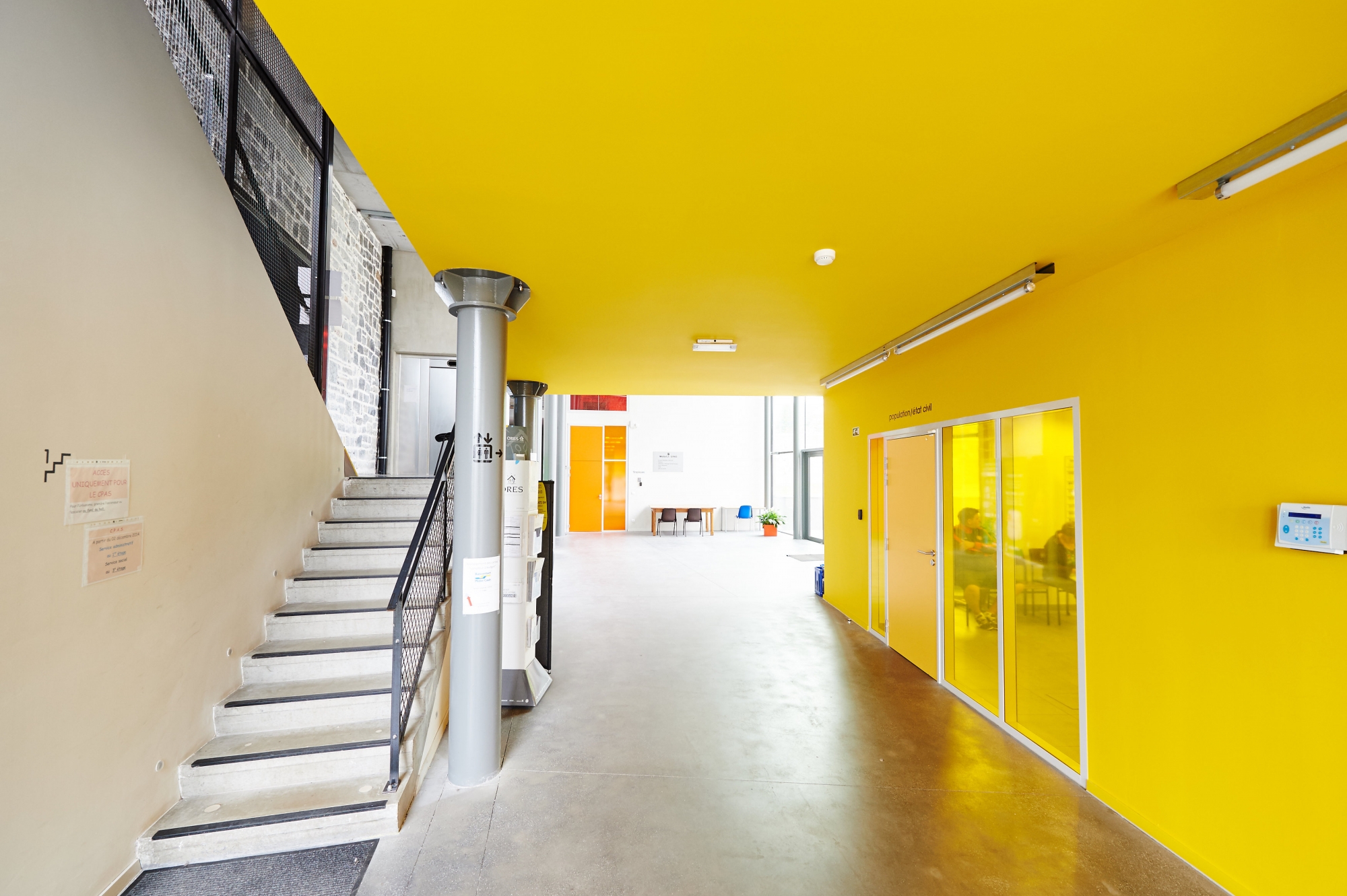 Un hall commun accessible depuis la place dessert les différents niveaux des bâtiments via un ascenseur et un jeu d’escaliers participant à la qualité spatiale de l’ensemble. La lumière naturelle pénètre ainsi au cœur du projet. La complémentarité fonctionnelle permet à une unité de cogénération de chauffer l’ensemble des locaux et logements ainsi que la maison communale existante.