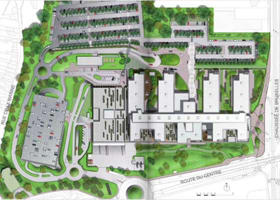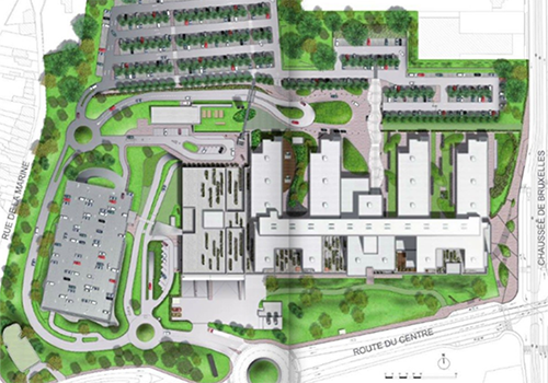 Nouvel Hôpital de 560 lits comprenant deux grandes parties, à savoir : en sous-sol (étages -1, -2, -3) : le bloc opératoire (20 salles), la salle de réveil, l’imagerie médicale, la stérilisation, au rez-de-chaussée et aux étages (+1, +2, +3) : les consultations (regroupées dans une aile) et 18 services d’hospitalisation. L’ensemble se développe sur ± 85.000 m².
