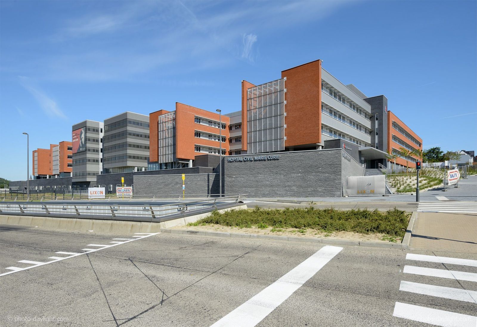 L’hôpital civil Marie Curie se développe sur 85.000 m² hors parking. Le socle du bâtiment abrite un plateau médicotechnique de 20.000 m² de plain-pied, les services d’imagerie médicale, laboratoire, pharmacie et logistique.
